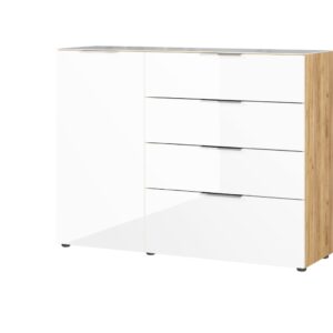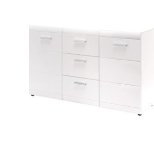 Ponúkame túto širokú komodu so šírkou 151 cm, výškou 98 cm (s vysokými kovovými nožičkami) a hĺbkou 40 cm. Táto komoda je univerzálnym kusom nábytku, ako aj poskytuje veľa úložného priestoru. Model disponuje dvomi tlmenými dvierkami a tromi zásuvkami s technológiou tichého zatvárania. Za dvierkami sa nachádzajú dve priehradky a dve nastaviteľné police. Všetok nábytok sa vyrába s použitím vysokokvalitných ABS hrán, ako aj má odolný povrch z melamínovej živice, ktorý odpudzuje vlhkosť.